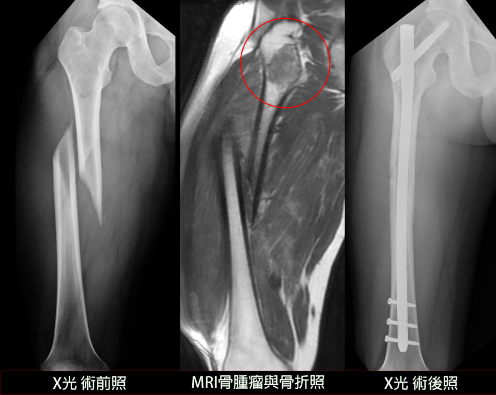 所幸初步化驗結果證實腫瘤為良性,他隨即將腫瘤組織徹底刮除,復位大腿骨折,並植入骨髓內鋼釘同時穩固骨腫瘤刮除後的空洞與骨折部位,透過跨科整合,一次性解決了原本複雜的雙重難題。一周後正式的病理報告證實是良性的纖維發育不全(Fibrous dysplasia),患者與家屬也終於可以放下心中的擔憂。