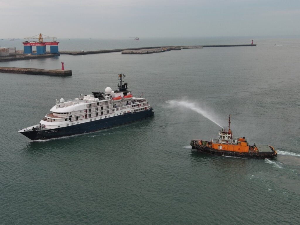 疫後七年國際郵輪進台中港,港務分公司以噴水禮迎接島嶼天空蒞臨。(記者孫義方攝)