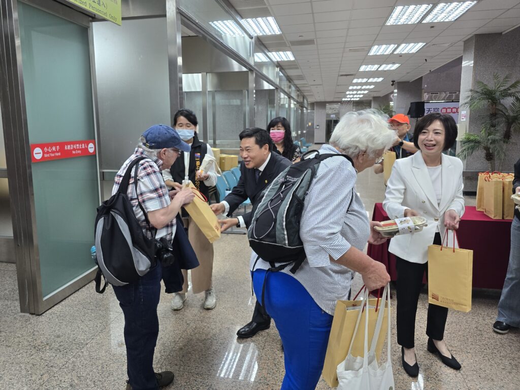 臺中港務分公司林總經理春福(左後二)及立法院何委員欣純(右後一)致贈到港旅客紀念品。(記者孫義方攝)