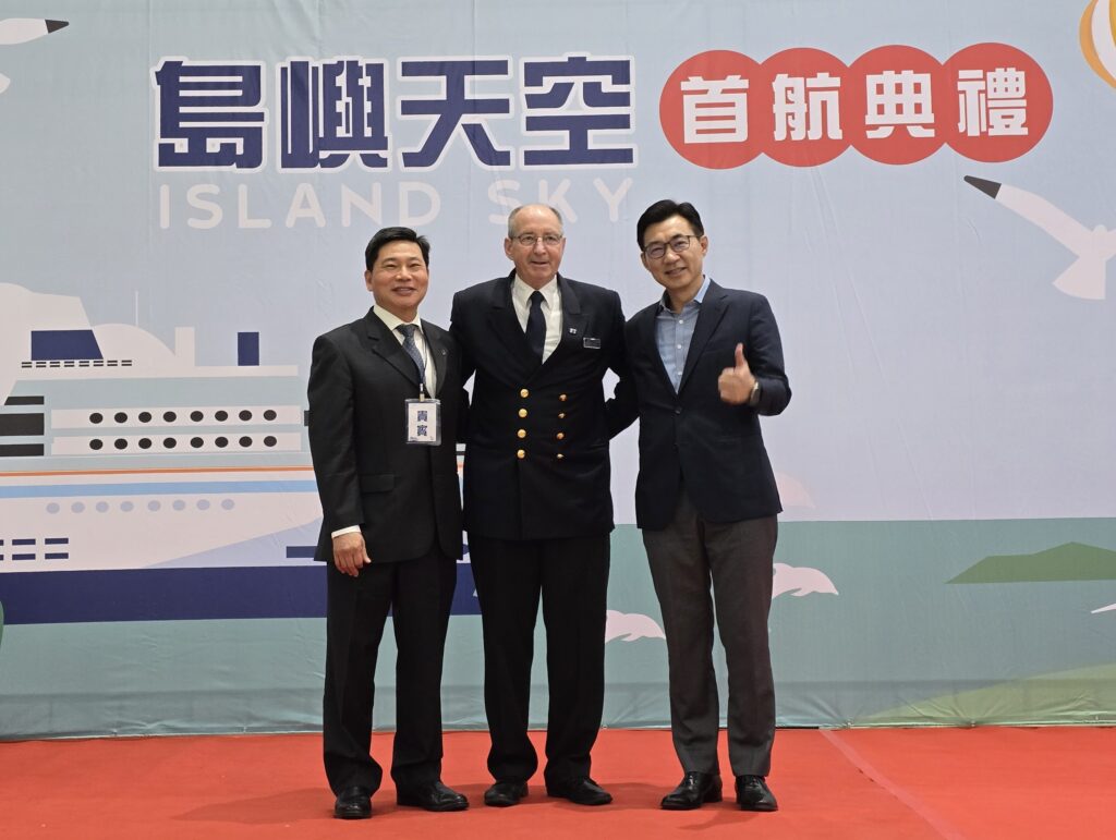 島嶼天空首航臺中港典禮,左起:港務分公司總經理林春福、島嶼天空郵輪船長Horne, Stuart Verno、立法院江副院長啟臣。(記者孫義方攝)