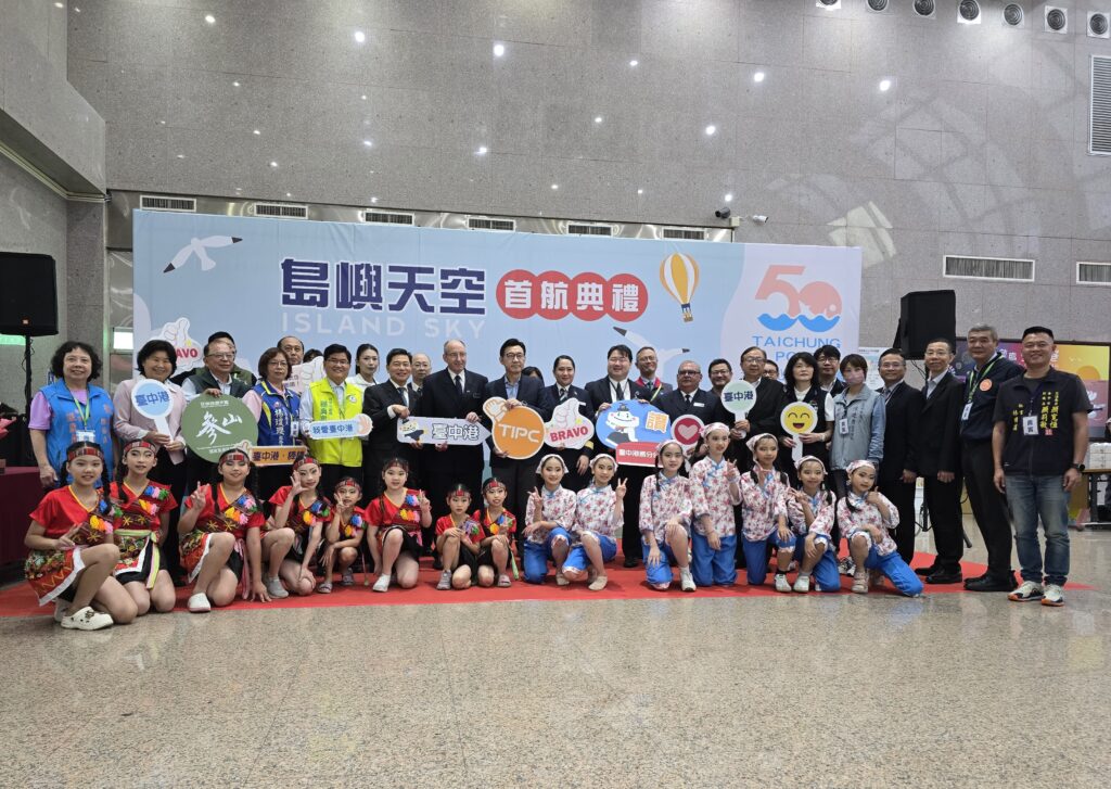 島嶼天空首航臺中港典禮貴賓及表演團體合影。(記者孫義方攝)