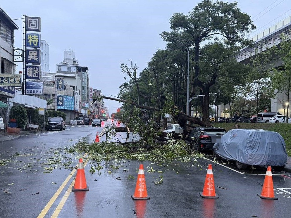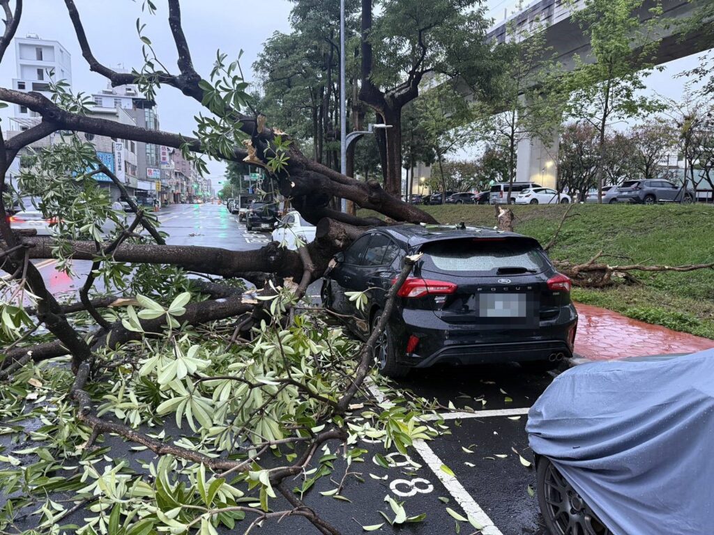警方調查,現場是路樹倒塌壓損一輛停放於路旁轎車,已通報相關權責單位到場協助,排除路樹,依規定通知車主到場了解及後續處理。