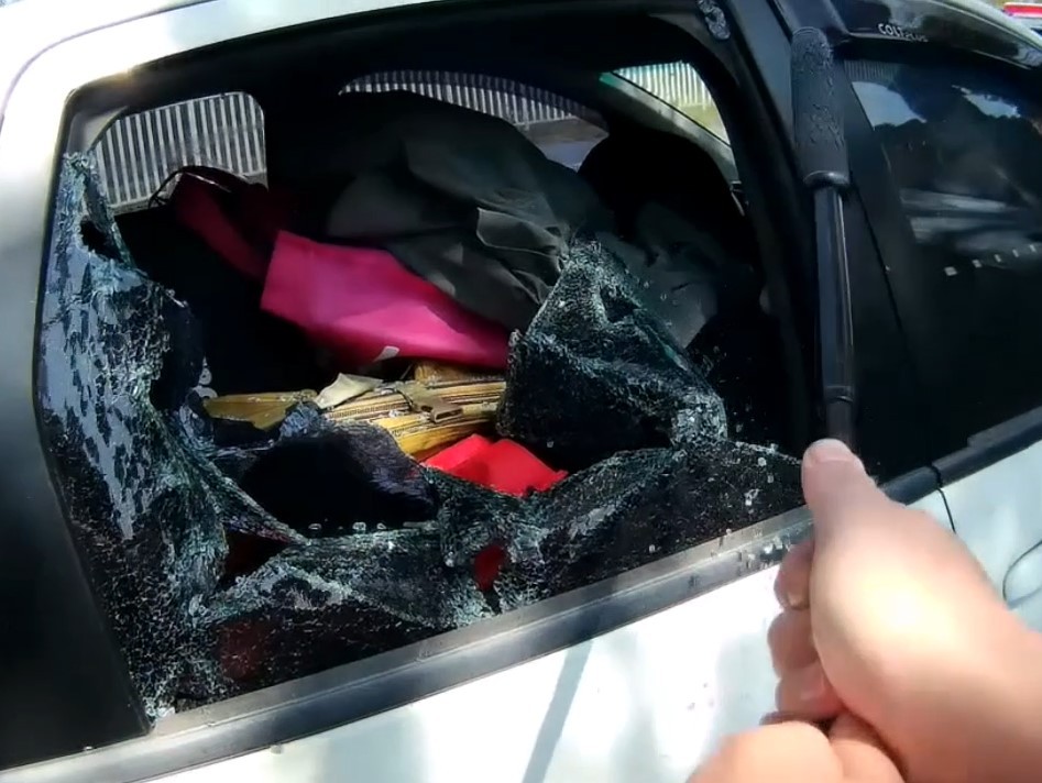 員警取得顏女同意後,敲破距離女嬰最遠的右後座玻璃。(記者孫義方攝)