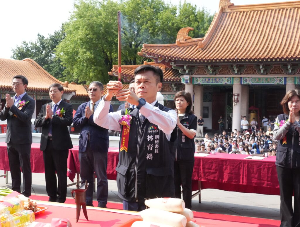 台中市政府副秘書長林育鴻擔任主祭官,帶領陪祭官及祈福民眾循古禮向至聖先師孔子虔誠參拜祈福。(記者孫義方攝)