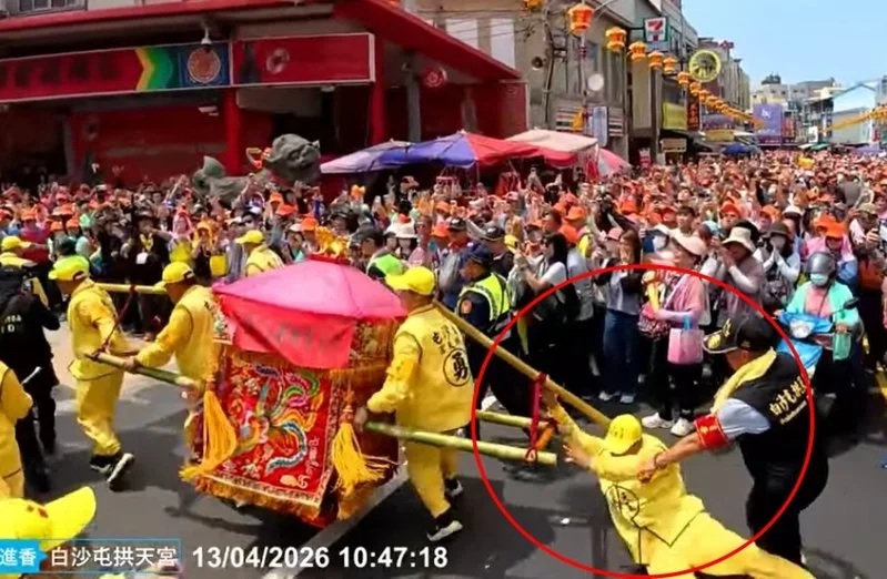 白沙屯媽祖進香十三日中午到大甲鎮瀾宮前停駕,粉紅超跑大甩尾,轎班人員(紅圈處)摔倒。(記者孫義方攝)