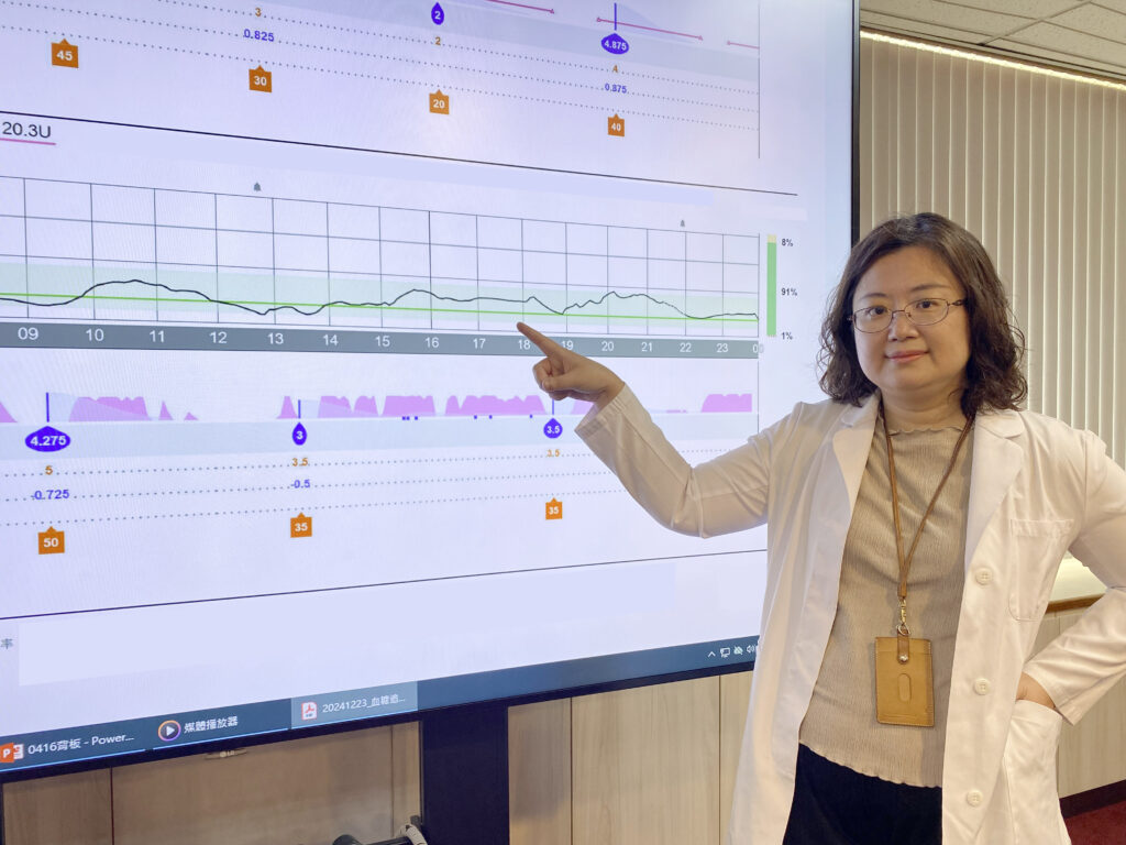 臺中榮總內分泌新陳代謝科醫師蔡易婷指出,透過胰島素幫浦結合連續血糖監測系統,病友余女可精準控制每日血糖都在標準範圍內(手指處淺綠色區域)。(記者孫義方攝)