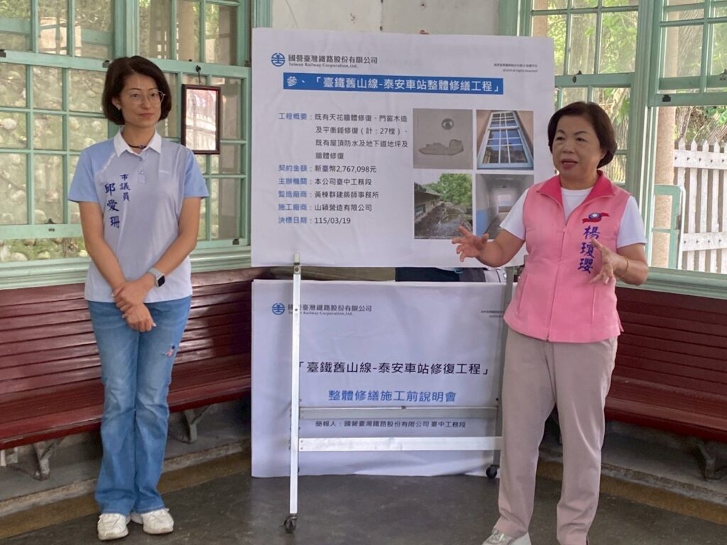 修繕工程預計工期半年,楊瓊瓔盼趕在今年九月底前完工,重現舊山線古蹟車站昔日風華。「縱貫鐵路舊山線–泰安車站」整體修繕施工前說明會,今天由台鐵公司台中工務段簡報,邀集台中市文化資產處、后里區公所、泰安里長謝學和及泰安社區發展協會理事長劉雪美等地方人士出席。